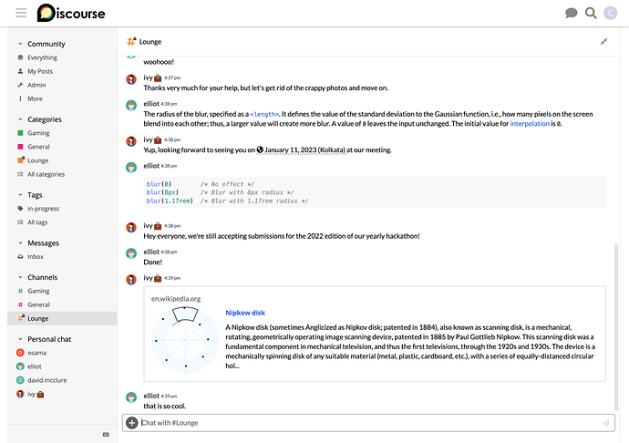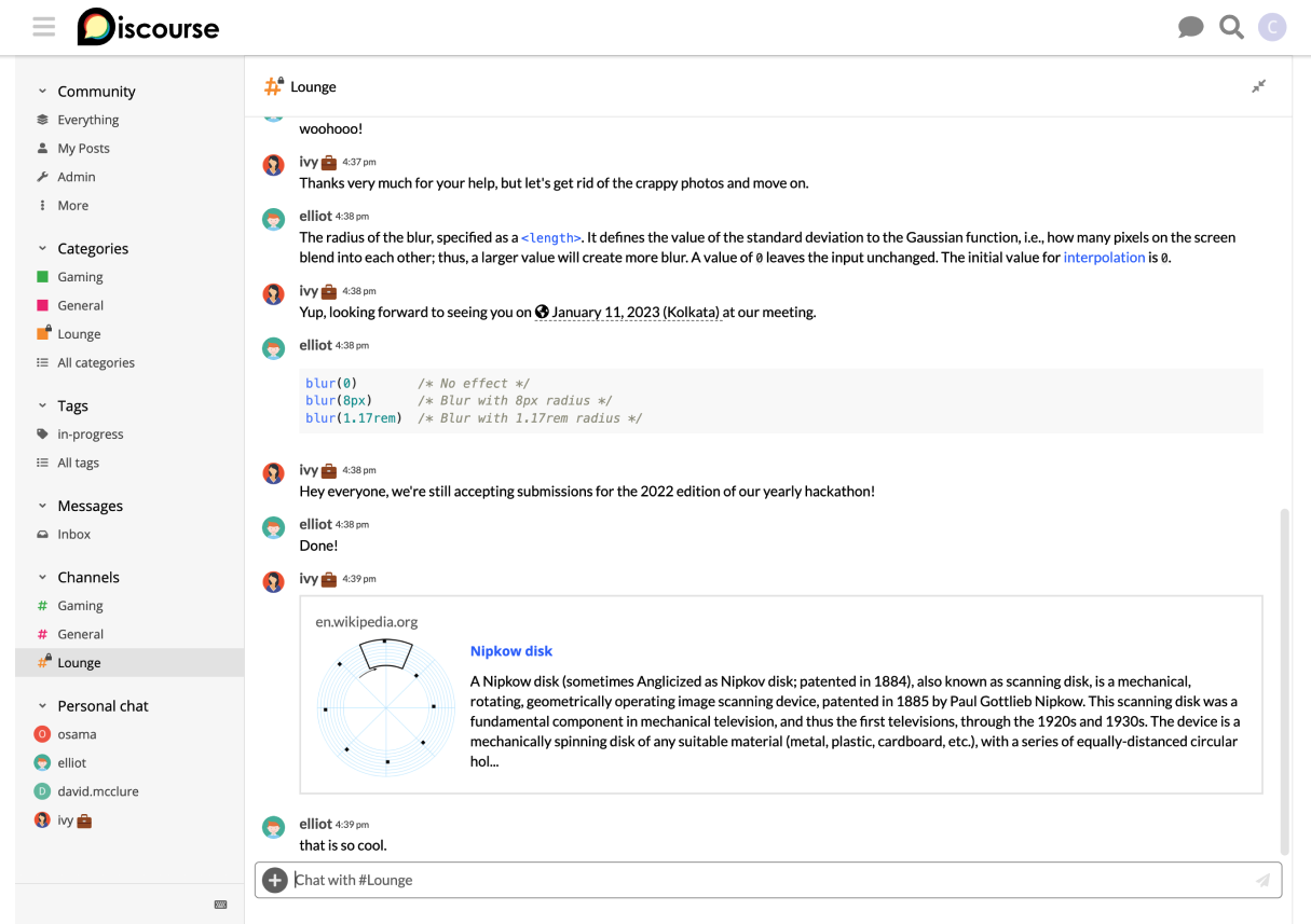 Discourse にリアルタイムチャット機能が追加されました。サイト管理者がコミュニティメンバーのためにチャンネルを作成し、カジュアルな議論を行える場を提供できるようになりました。