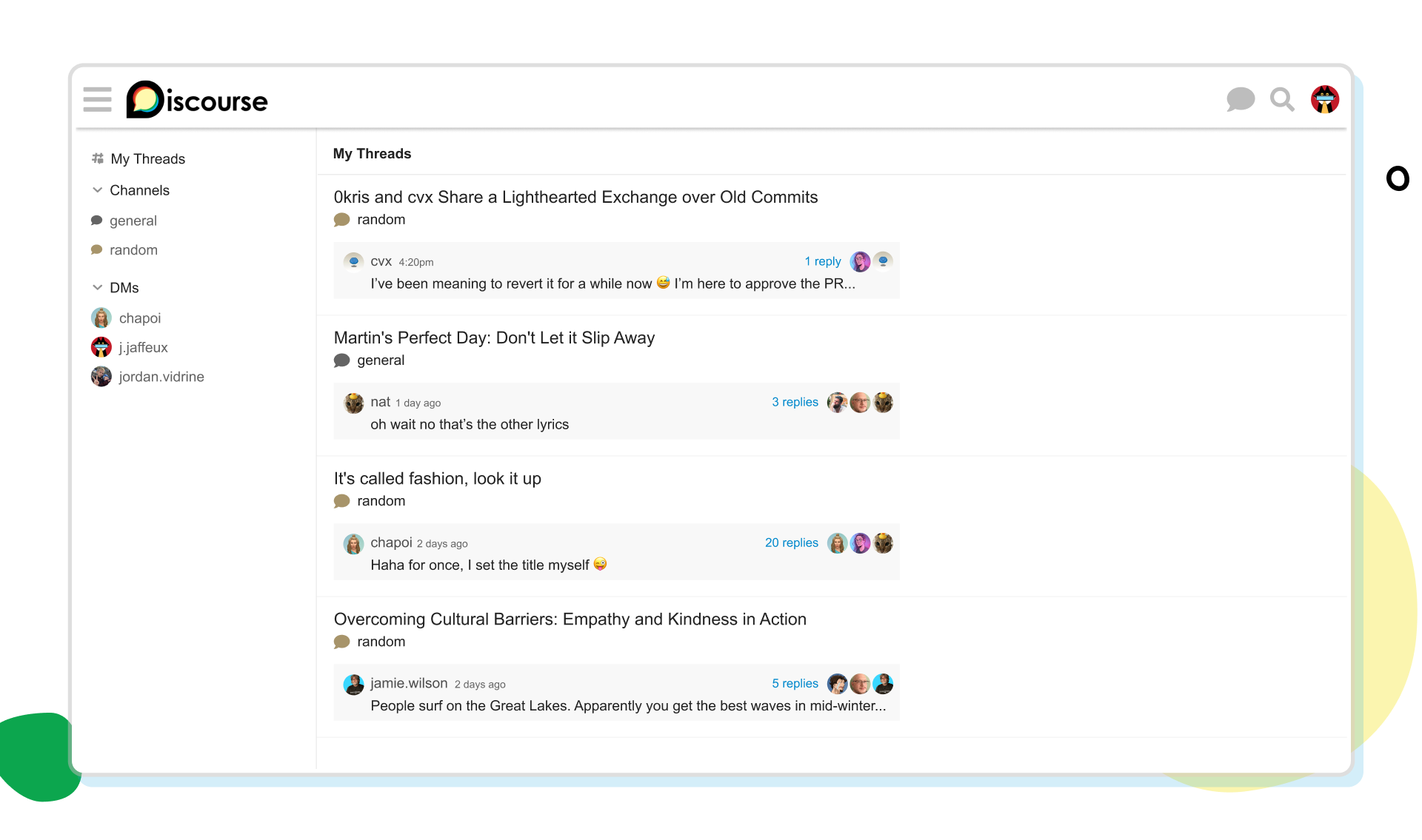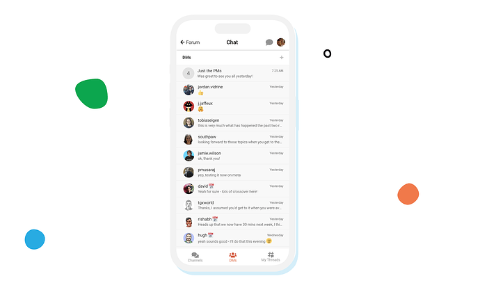 Discourse Chat では、改善されたモバイル体験をはじめとして、外出先でも意義ある会話に参加しやすくなりました。フォローしているすべてのスレッドを一か所で確認できるようになり、各チャンネルで参加できる新しい会話も発見できます。また、少人数グループでのチャット開始も簡単になり、会話が広がるにつれてメンバーを追加したりグループチャットに名前を付けたりすることも手軽に行えます。
