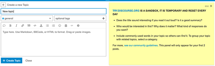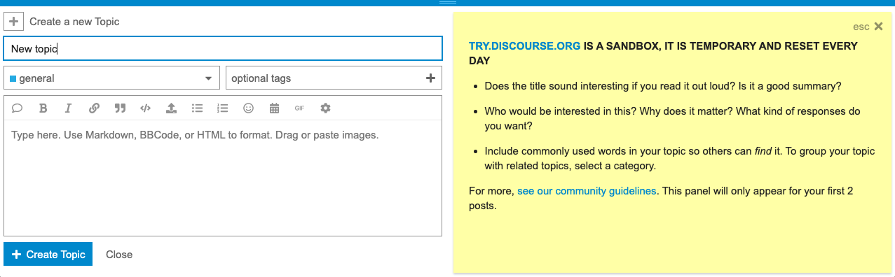 Discourseは「ジャストインタイムメッセージ」を使用して、最初の数回の投稿時に人々にルールを思い出させます。