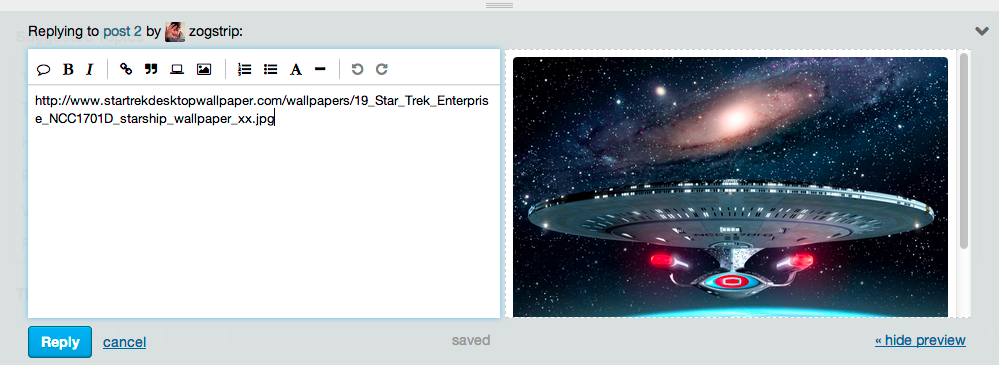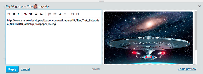しかし、私たちの画像サポートは主に、ディスカッションに収まる小さな画像向けに設計されていました。ユーザーが巨大な画像をアップロードしたり、巨大な画像へのリンクをペーストしたりすると、全員がその大きな画像をダウンロードしなければならず、より大きなサイズで画像を確認する便利な方法もありませんでした。さらに、巨大な画像をいくつか含むトピックが非常に人気になった場合、フォーラムのオーナーは膨大な帯域幅の請求を負担する可能性がありました。