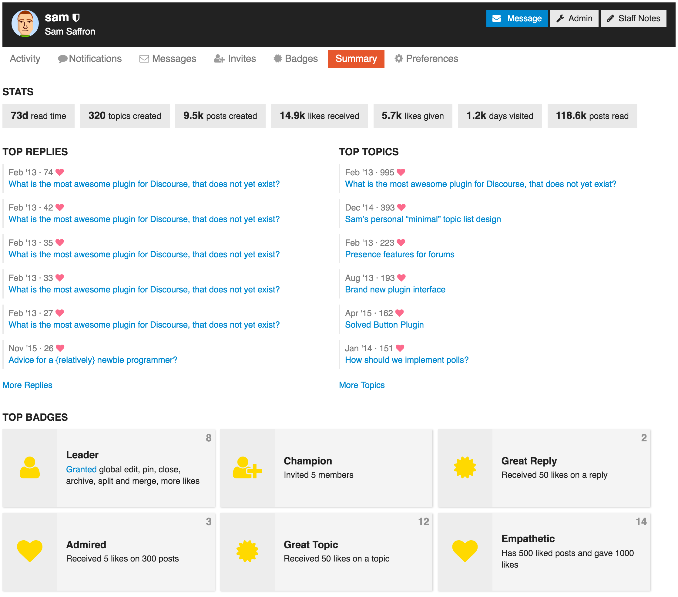 Discourse にはトップユーザーやトップトピックの機能がありますが、個々のユーザーのコミュニティへのトップ貢献を確認する方法が欠けていました。しかし、今後はそれが可能になりました!任意のユーザーページの「サマリー」タブをご覧いただくと、そのユーザーの「ベスト投稿集」を確認できます。