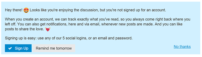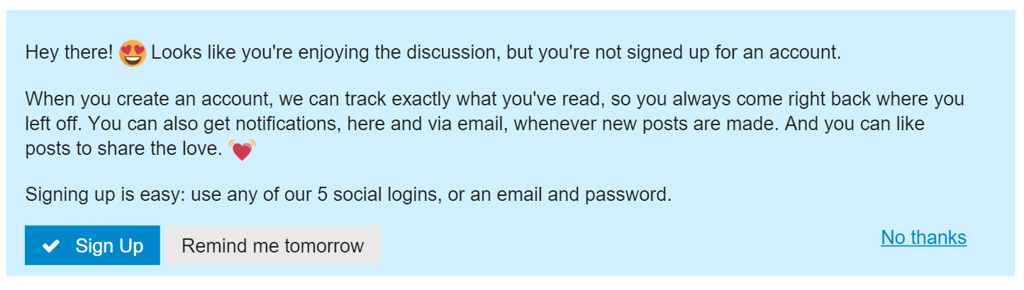今年の夏期インターンとしてKane York(別名「riking」)を再び迎え、彼はいつも通り素晴らしい仕事をしてくれました。彼が自ら提案し、実装した機能の一つが、匿名ユーザー向けのこの気の利いた行動喚起です。サイトを5分間閲覧し、少なくとも3つのトピックを開いた匿名ユーザーに対して、トピックの下部にサインアップしてアカウントを作成するよう誘う小さなバナーが表示されます!これはまさに私たちがDiscourseに組み込むことが大好きなジャストインタイムなアクションです。