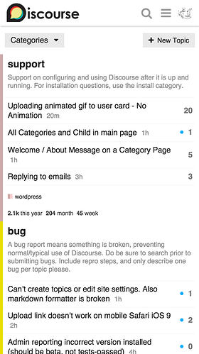 パフォーマンス向上のためにEmber 1.12にアップグレードし、少し遅めだったユーザーページの最適化にも時間をかけました。(また、ベンチマークではiOS 9のMobile SafariでDiscourseが10%高速化されており、Android ChromeをバージョンでAndroid Chrome 42から45へのアップグレードでパフォーマンスが30%向上することも確認しましたので、これらのJavaScriptパフォーマンス向上についても私たちの成果としていただければ幸いです。)