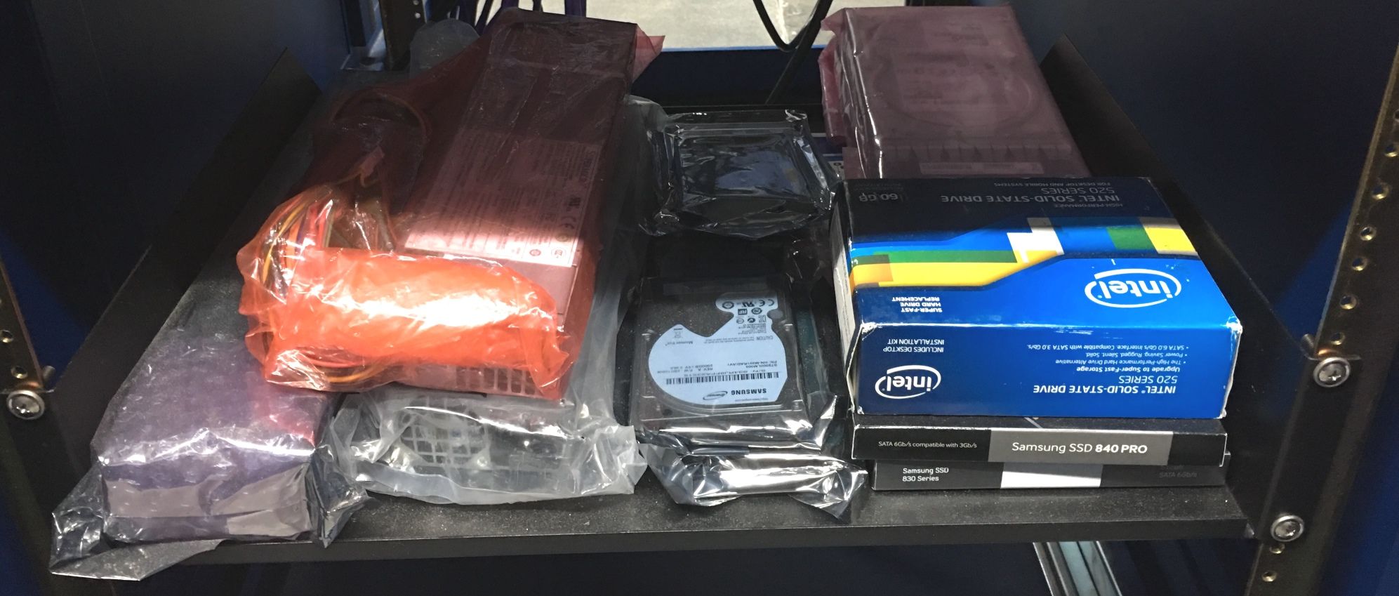 タイ1〜11によって優れたライブ冗長性を確保しており、タイ3や4が停止しても外部からは気づかれることすらないでしょう。サーバーで最もよく障害が発生する箇所はハードドライブと電源ユニットですので、万が一に備えて、以下の「コールドスペア」部品もラック下部の棚に保管しています: