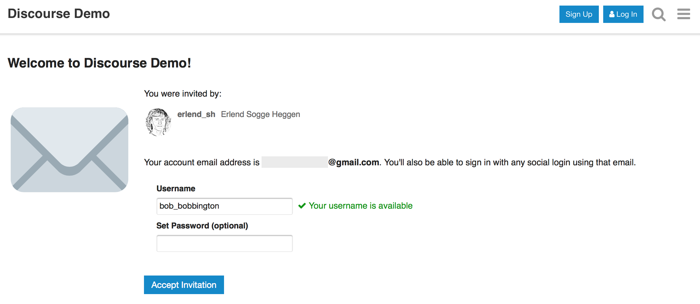 招待には、Discourse に招待されたユーザーがユーザー名、フルネーム(必要な場合)、パスワードを設定できる、適切で見栄えの良いランディングページが追加されました。