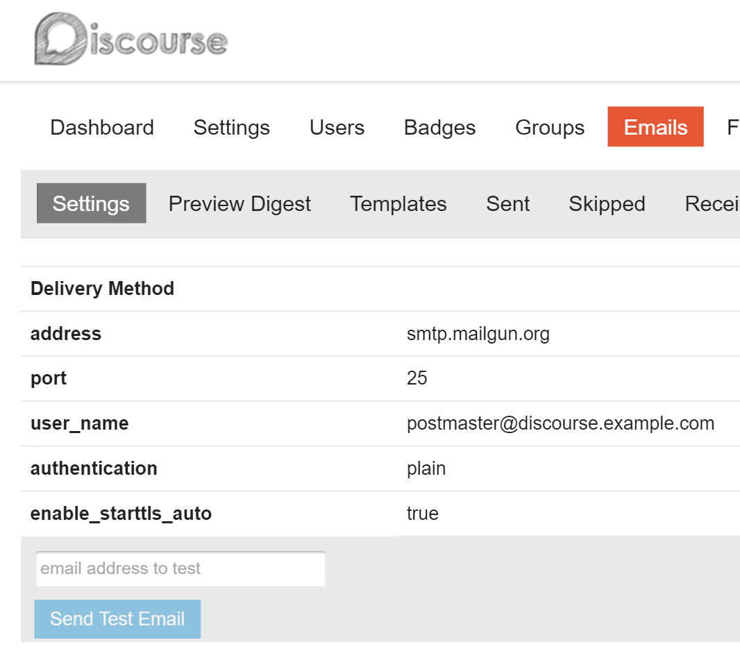 すべてが正常に動作していることを確認するには、DiscourseのAdmin画面でEmailsのページを開いて、概要を確認してください。app.ymlに入力した内容と一致していますか?