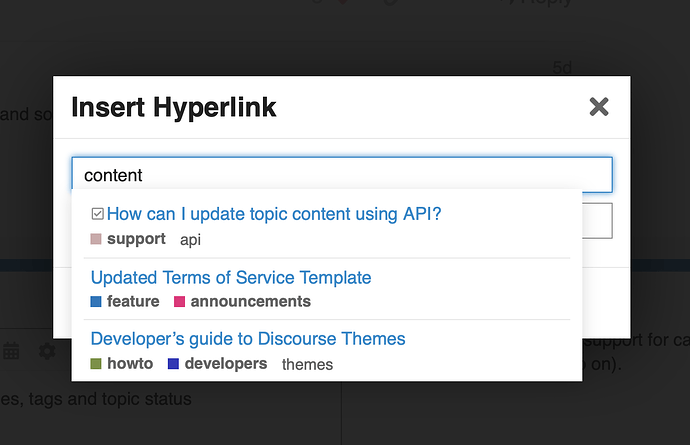 コンポーザーからハイパーリンクを挿入する際、これまでは URL を貼り付けることしかできませんでした。なんとも味気ない!今では、同じフィールドから直接既存のトピックを動的に検索できるようになりました。入力を開始するだけで検索が始まります!