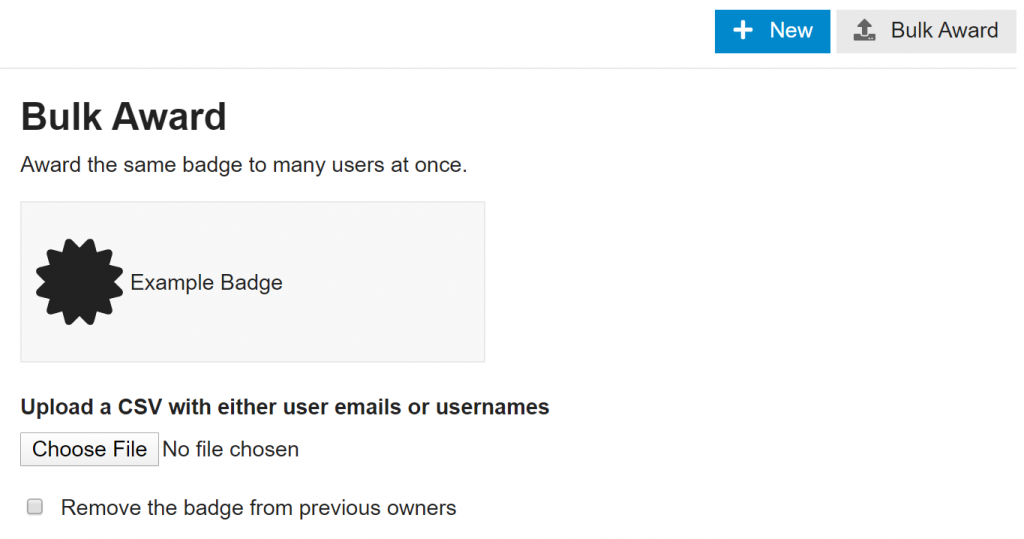 「Bulk Award」ボタンを押すと、ユーザー名またはメールアドレスのシンプルな CSV リストに対してバッジを付与できます。詳細についてはこのトピックをご覧ください。