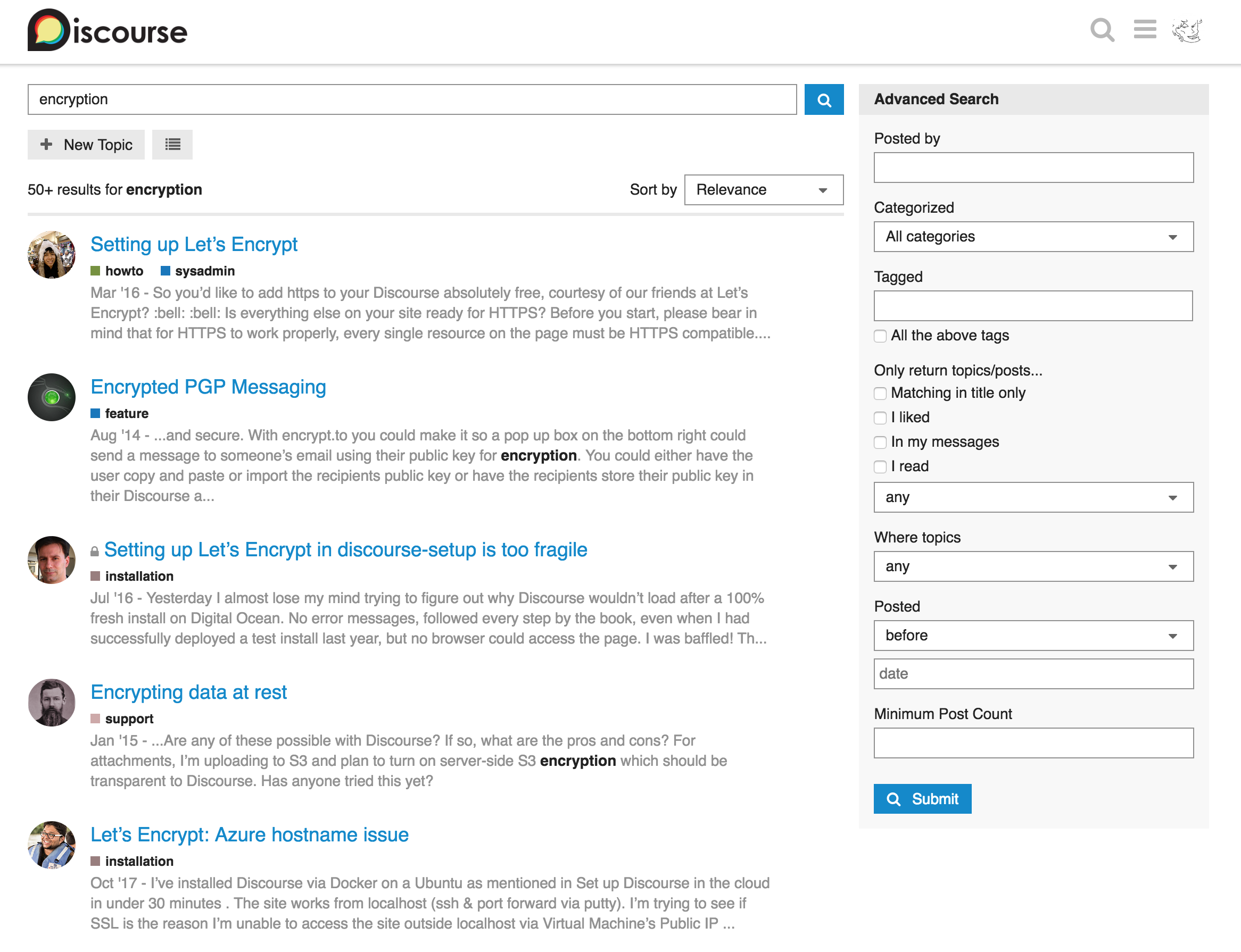 タブレット、ラップトップ、デスクトップでより大きな画面を有効活用できるよう、幅広の検索ページレイアウトを改善しました。また、タイトルへの直接マッチに対する検索の関連性を大幅に向上させ、多くのリクエストがあった「トピックタイトルのみを検索する」オプションも追加しました。