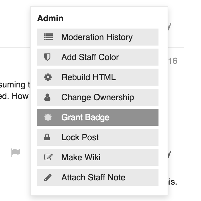 コミュニティメンバーに少し追加の励ましを与えたいですか?スタッフは任意の投稿に対する管理レンチアクションから、ユーザーに任意のバッジを付与できるようになりました。