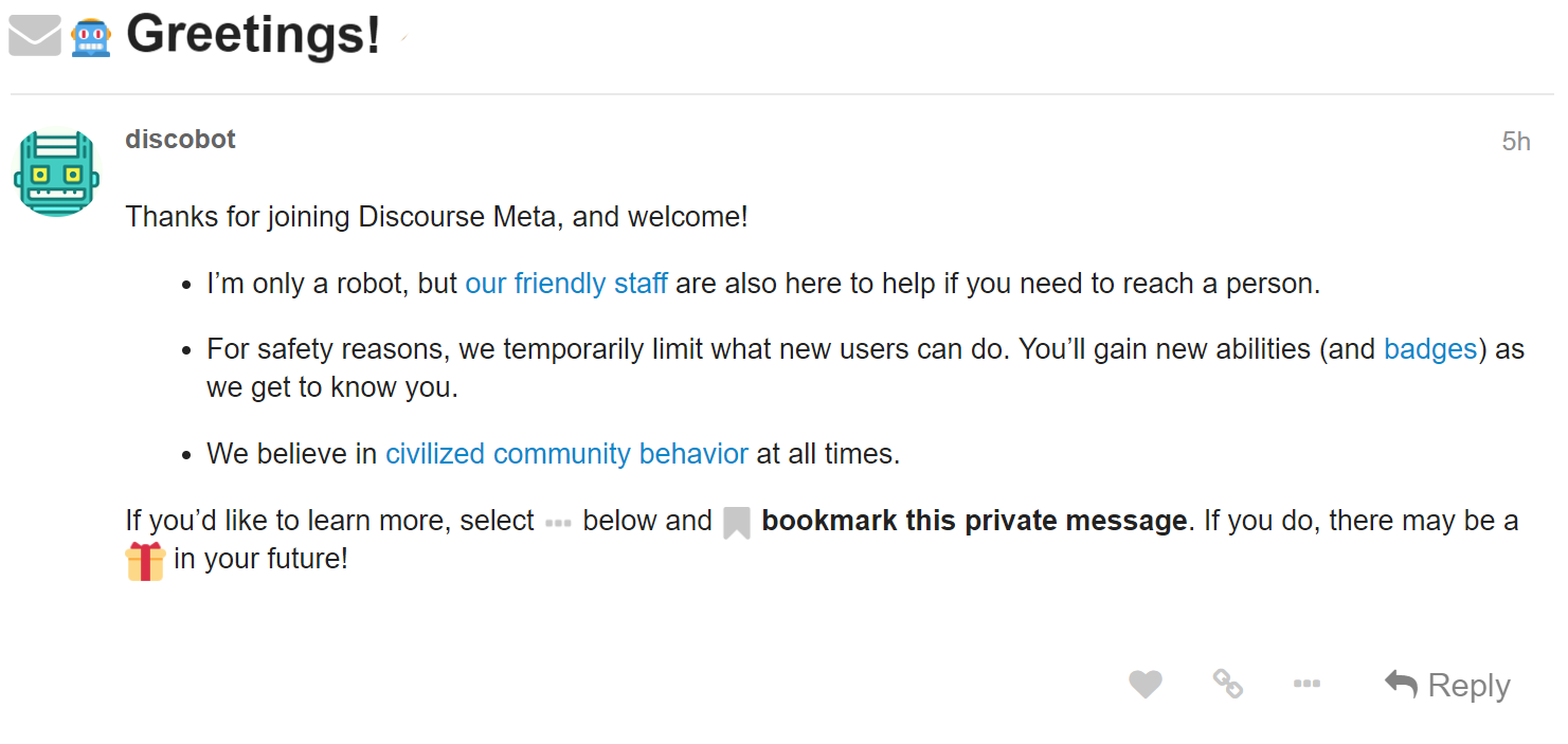 Discourse 1.8以降、新しく参加したすべてのユーザーはdiscobotからウェルカムPMを受け取ります。