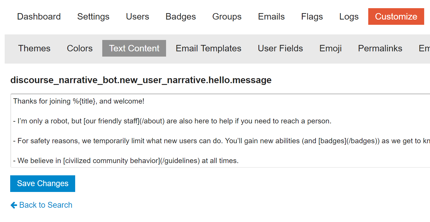 変更したい内容を正確に見つけるために、特定の単語や文章を検索することをお勧めします。Discourseのすべてのテキストはカスタマイズ可能であることを覚えておいてください。discobotに関連するテキストだけを見つけるにはnarrative_botで検索してください。