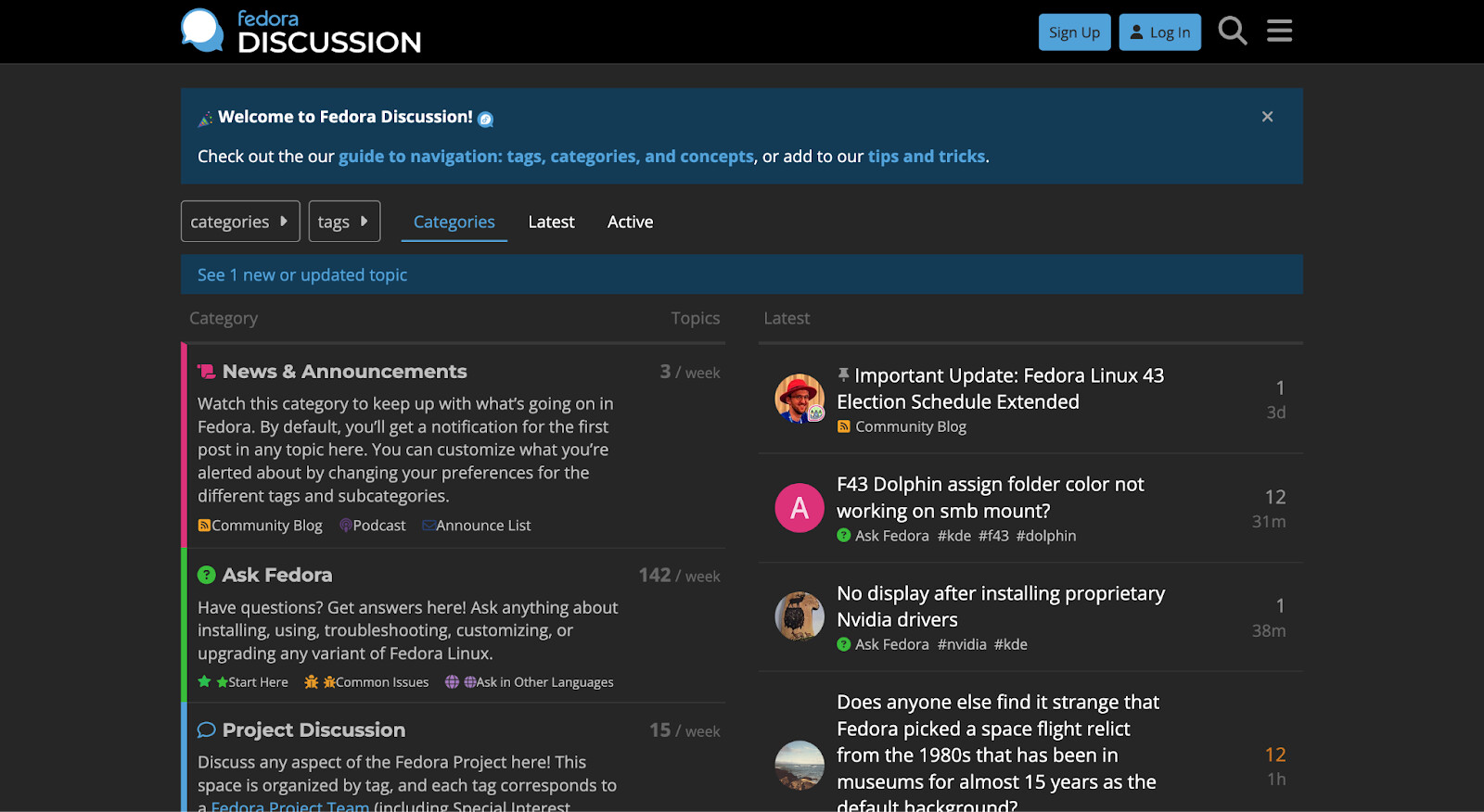 Fedoraプロジェクトは、ウェブ上で最もアクティブなLinuxディストリビューションフォーラムのひとつを運営しています。そのDiscussionハブは、インストールのトラブルシューティングを行うユーザーと、次のリリースを調整するコントリビューターの両方を対象としています。Ask Fedoraを閲覧すると、特定のハードウェアを動作させる方法、カーネルアップデート後のブート問題の解決、システムパフォーマンスの最適化に関する詳細なスレッドが見つかります。このフォーラムはユーザーグループを通じて複数の言語にも対応しています。