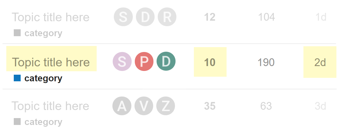 薄い赤い線より上にあるトピックは、前回の訪問以降に新しく追加または更新されたものです。トピックを最後まで読んだ場合、そのタイトルは黒ではなく薄いグレーで表示されます。