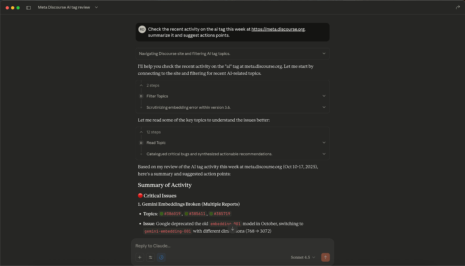Anthropicが約1年前にAIエージェントとのインターフェースに関するModel Context Protocol (MCP)の提案をオープンソース化した直後から、私たちはそれがDiscourseとどれほど相性が良いかについて興奮し始めました。