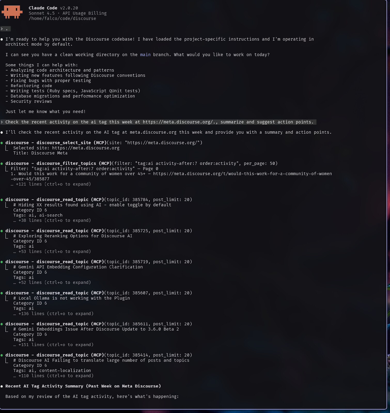 コミュニティがDiscourseの公式MCPサーバーを要求するのに時間はかかりませんでした。非常に多様なユーザーベースに対して有用なものを迅速に提供する方法について多くのアプローチを検討した結果、Discourse MCP CLIを紹介できることを嬉しく思います。